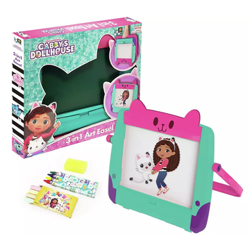Gabby's Dollhouse Art Easel, the ultimate creative tool for young artists! This 4 in 1 easel is designed to ignite imagination and provide endless fun. With a drawing board, magnetic board, rub-on board featuring Gabby's lovable characters, and more, this easel offers a variety of creative options. Whether your little ones want to draw, play with magnets, or add some whimsical charm with rub-on characters, this versatile easel has it all. Let their creativity run wild as they explore different artistic mediums with the Gabby's Dollhouse Art Easel!