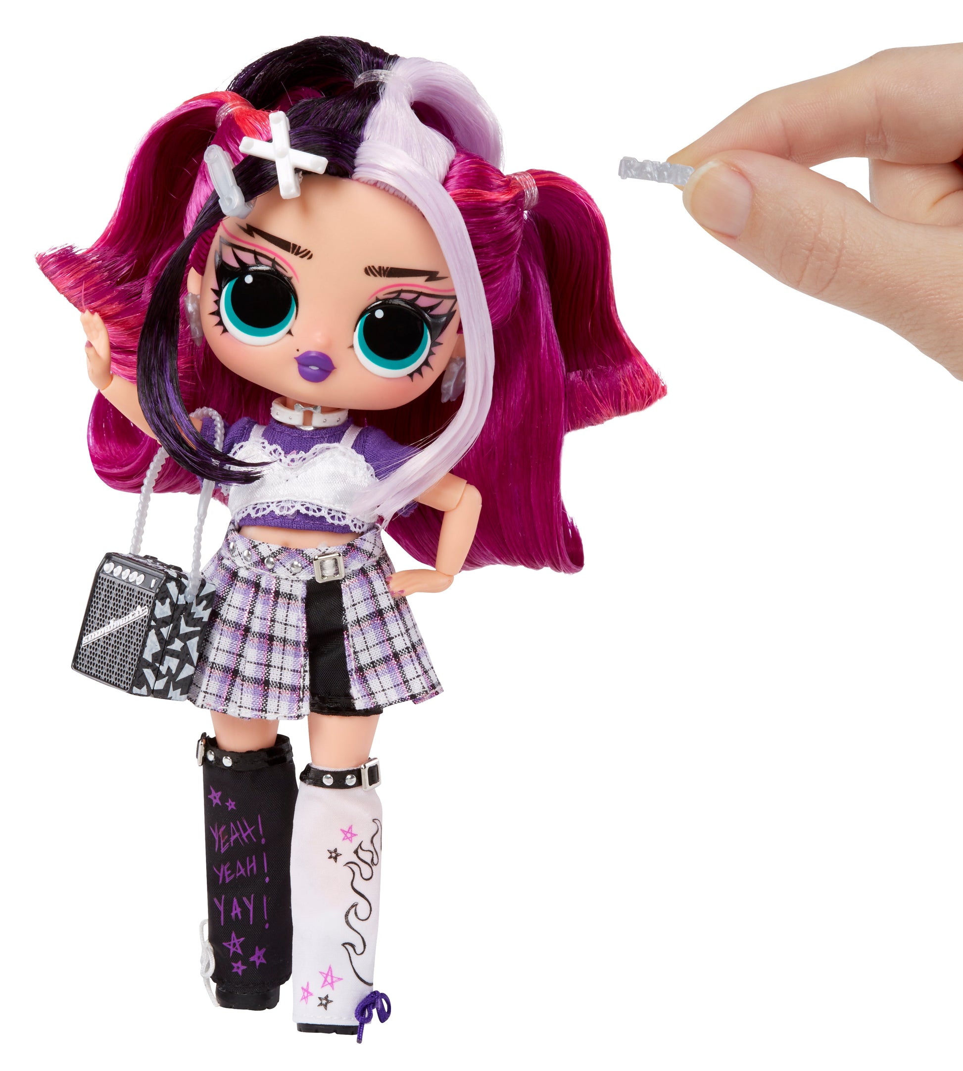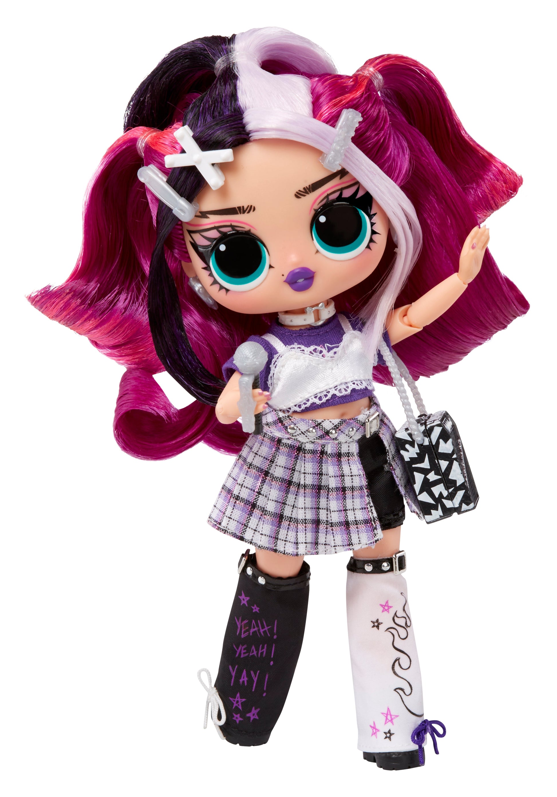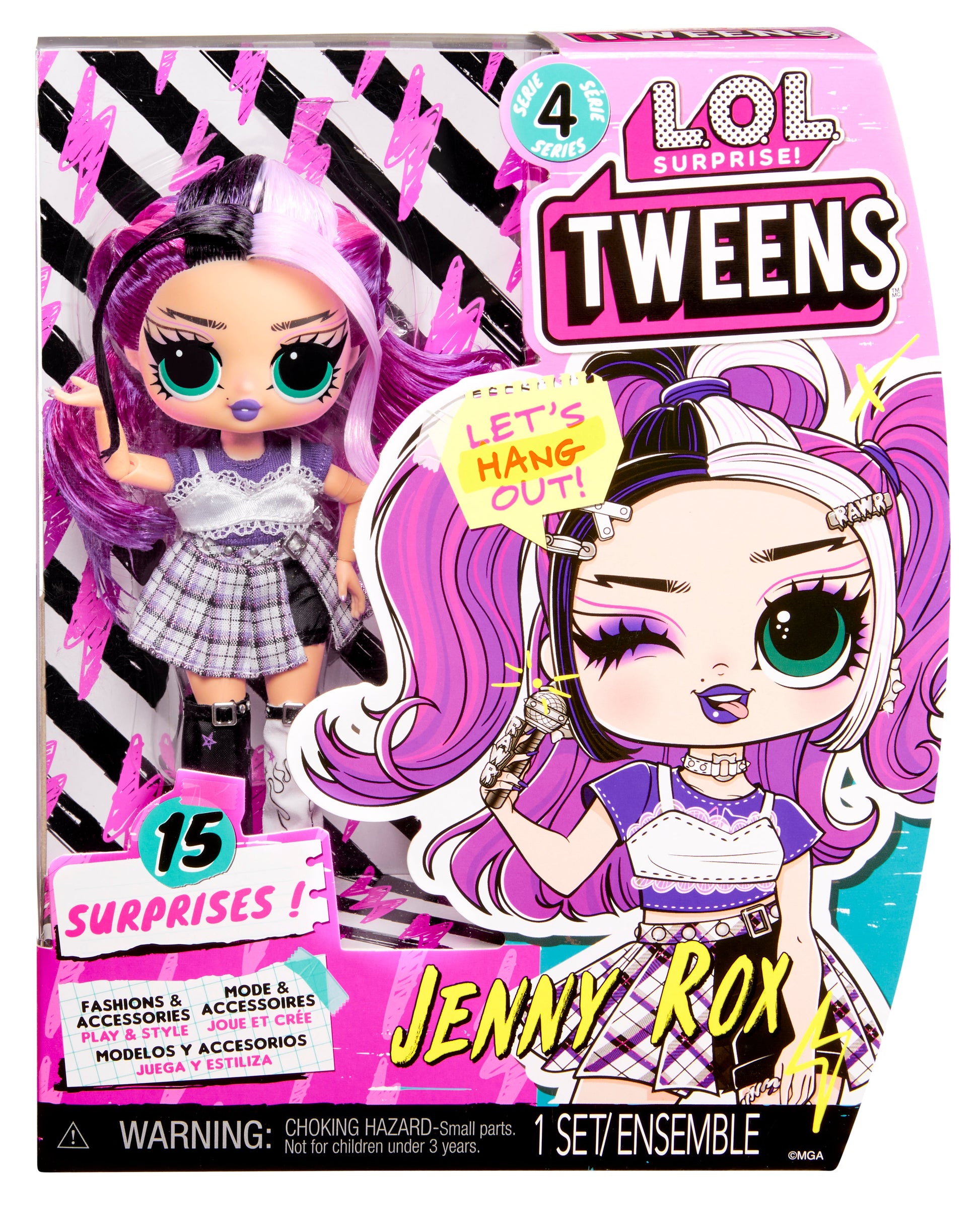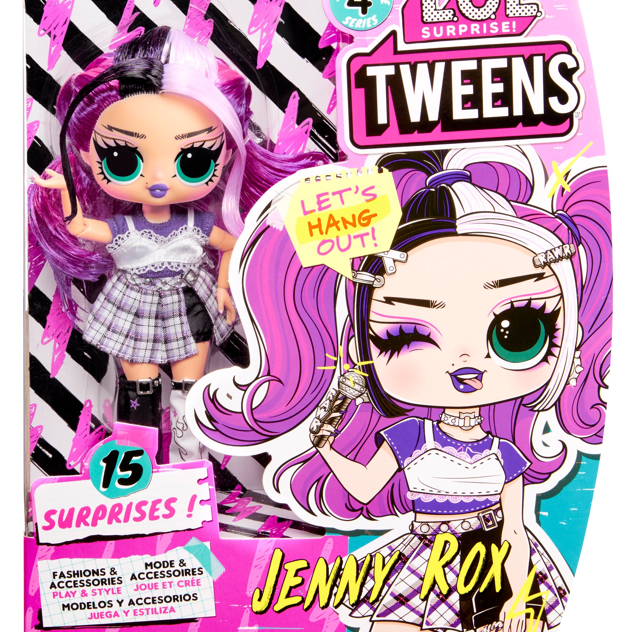Introducing the all-new LOL Surprise Tweens fashion doll Jenny Rox, big sister to adored character Roadie! Unbox 15 surprises and get ready to own the stage with Jenny Rox in her popstar outfit and rockstar hair while performing with her glam mic.