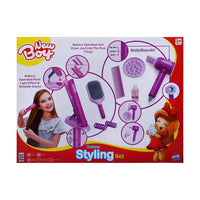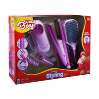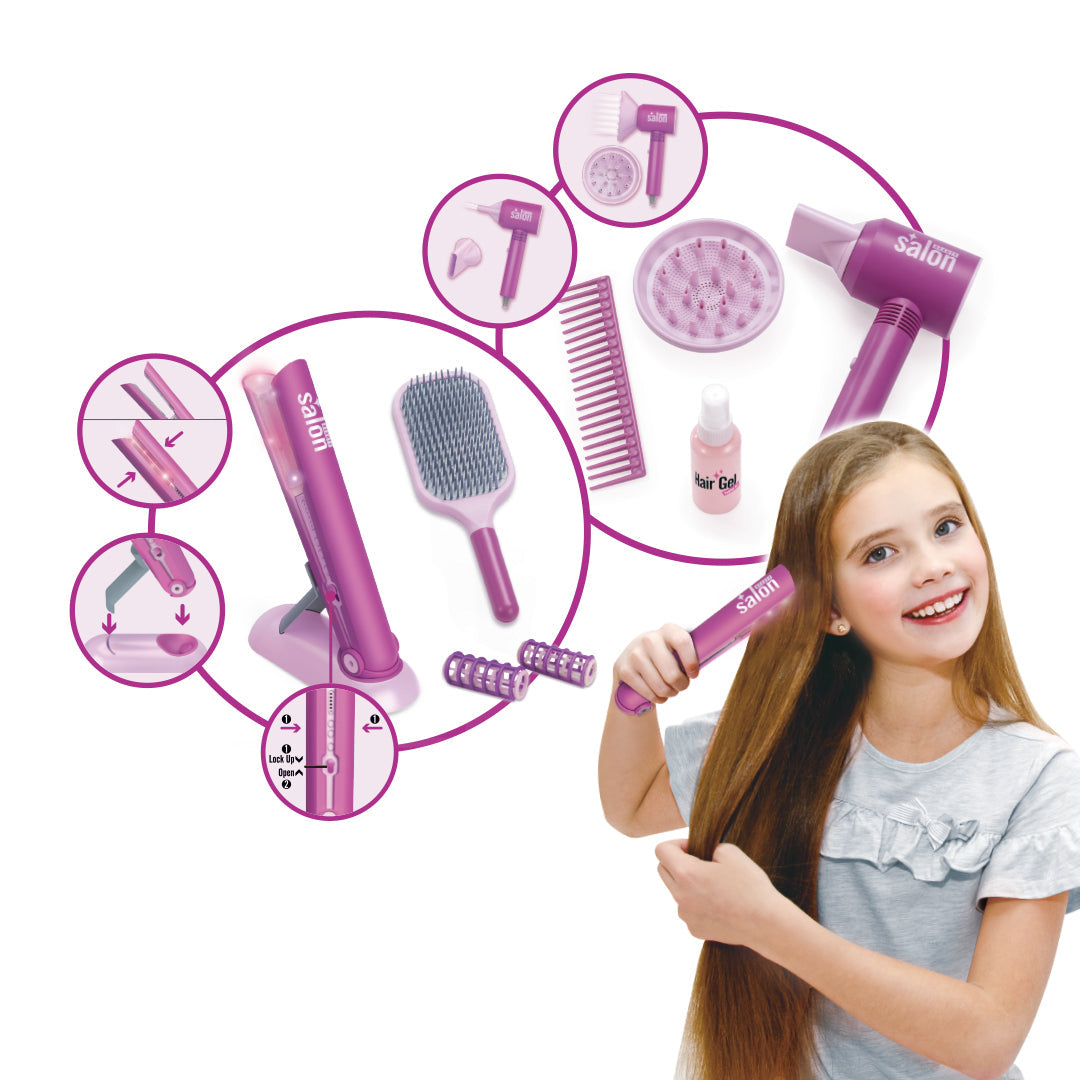 Includes a variety of hair styling tools such as a battery-operated Hair Straightener, comb, and hair clips