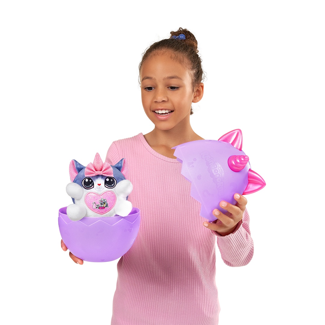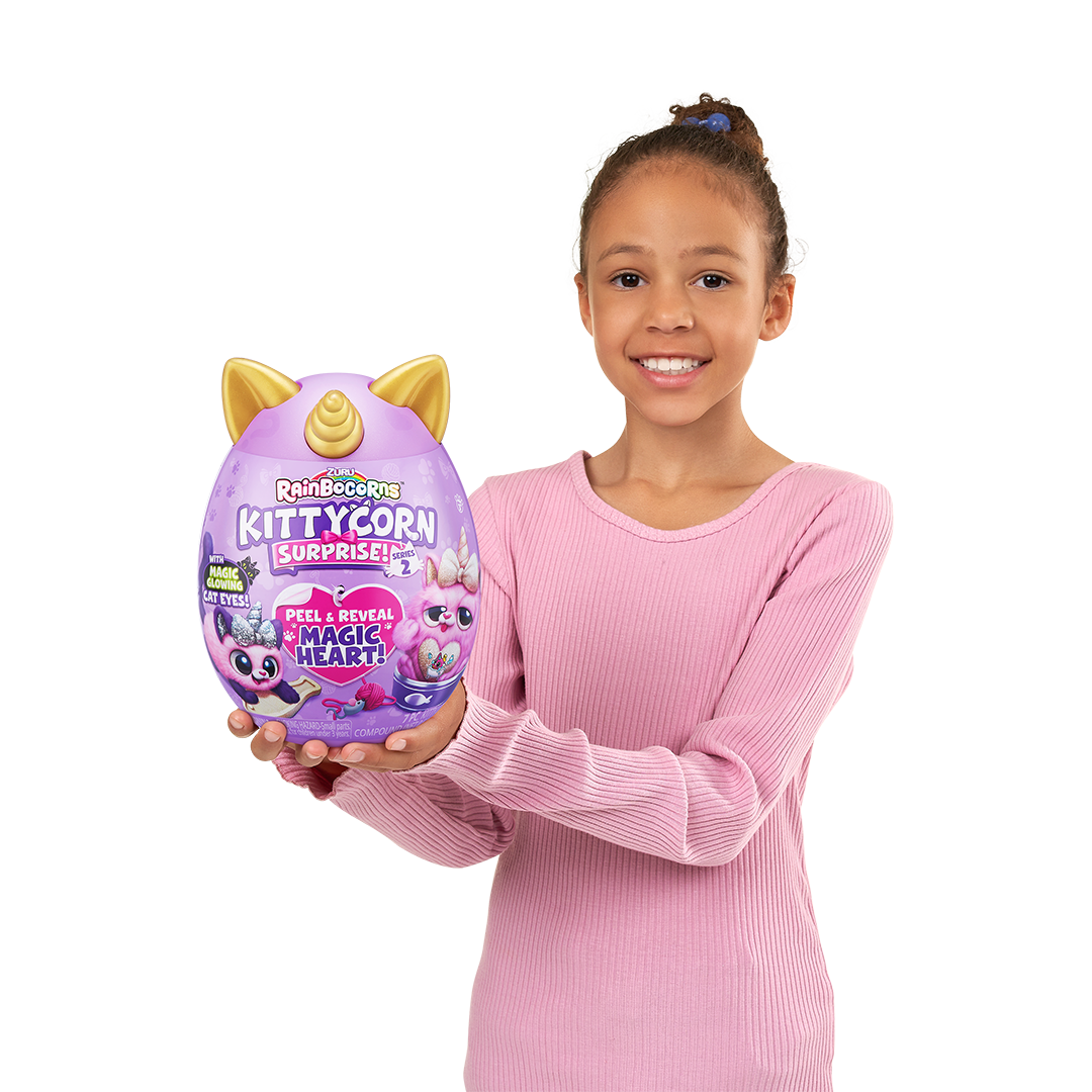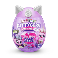 Rainbocorns Kittycorn Surprise are destined to be your new paw-fect pal! These kitties come with eyes that glow in the dark and a magic peel and reveal heart that tells you what your kittycorn loves! There are 10 surprises inside including gooey kitty litter compound and stickers! Adopt all 6 kittens, including the rare big bow kittycorn!