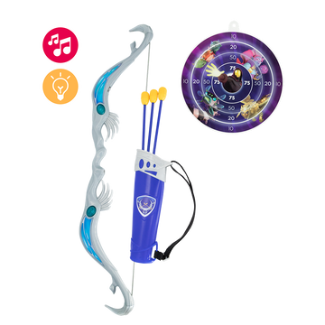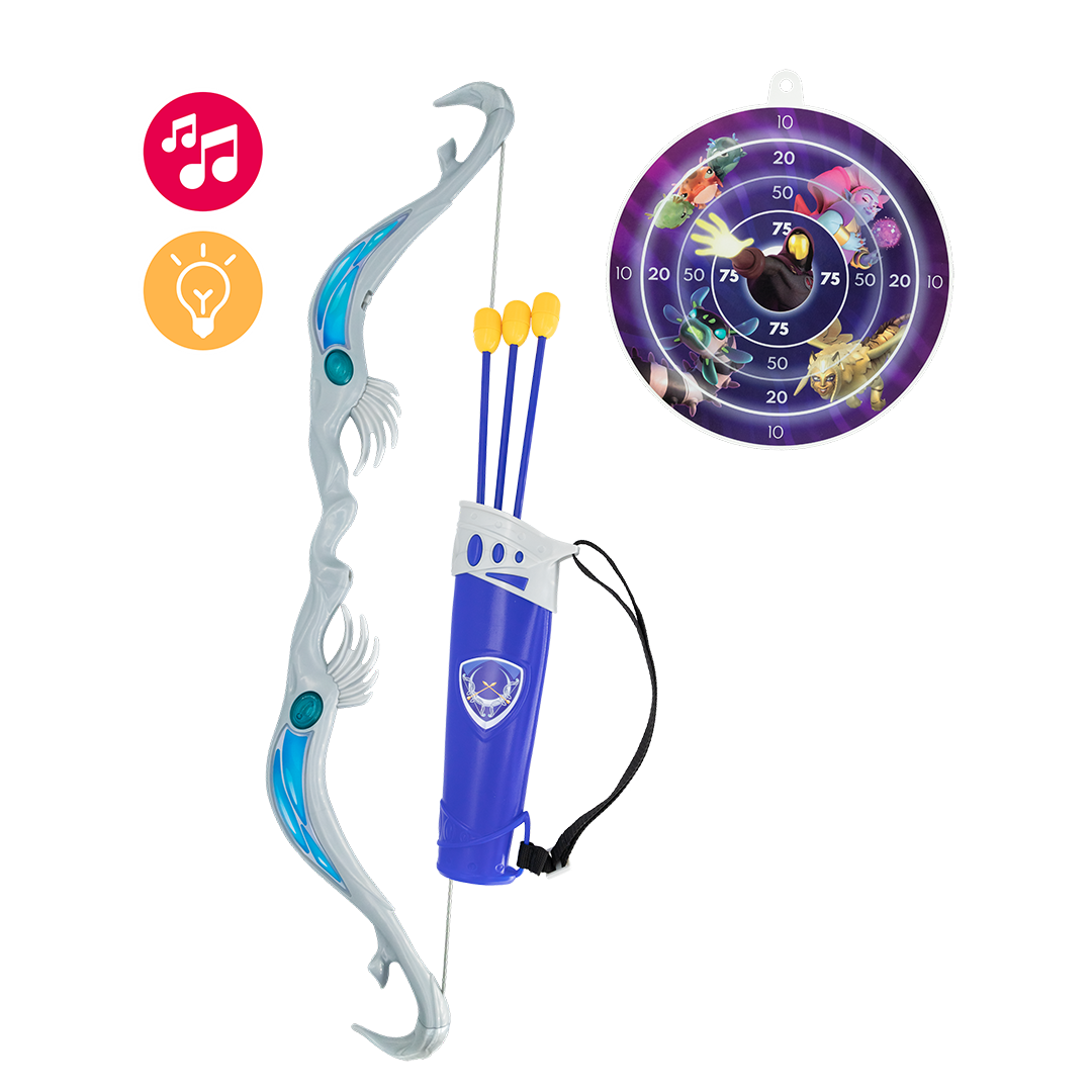 Put the arrow in the bow and launching it to the target card provided, a light and sound effect will be activated
