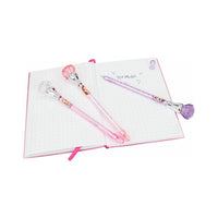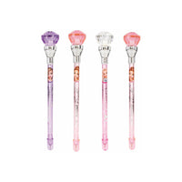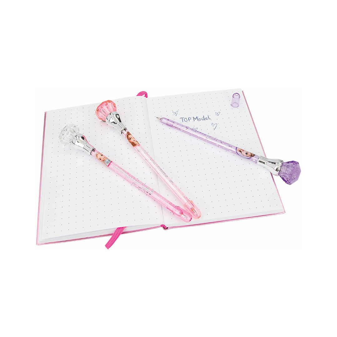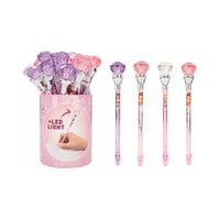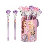 Glitter, glamour, ingenious! The gorgeous TOPModel pens from the Glitter Queen line have a beautiful diamond topper that glows when pressed on when writing. 3 different pens: purple barrel with purple diamond, pink barrel with pink diamond and pink barrel with white diamond. The blue writing leads of the pens and the batteries included are not replaceable.